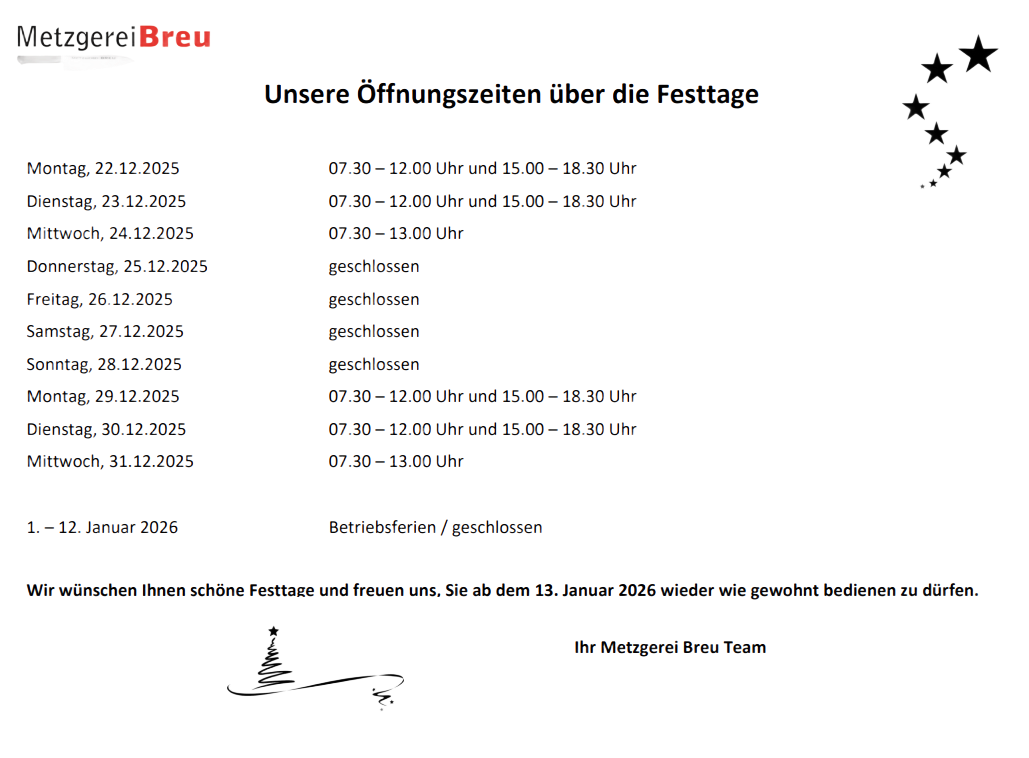Das Metzgerei Breu Team nimmt Ihre Bestellung gerne bis 10:00 Uhr